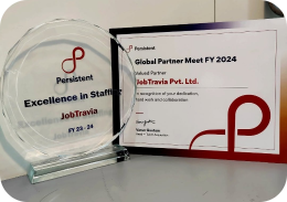 JobTravia was honored with the “Best Staffing Award” at the Persistent Systems Global Partner Meet, celebrating our commitment to delivering top-quality talent and seamless workforce solutions.